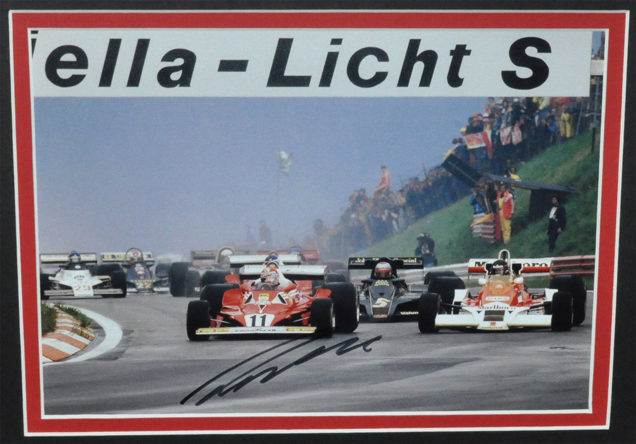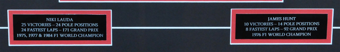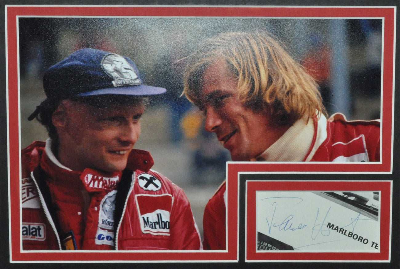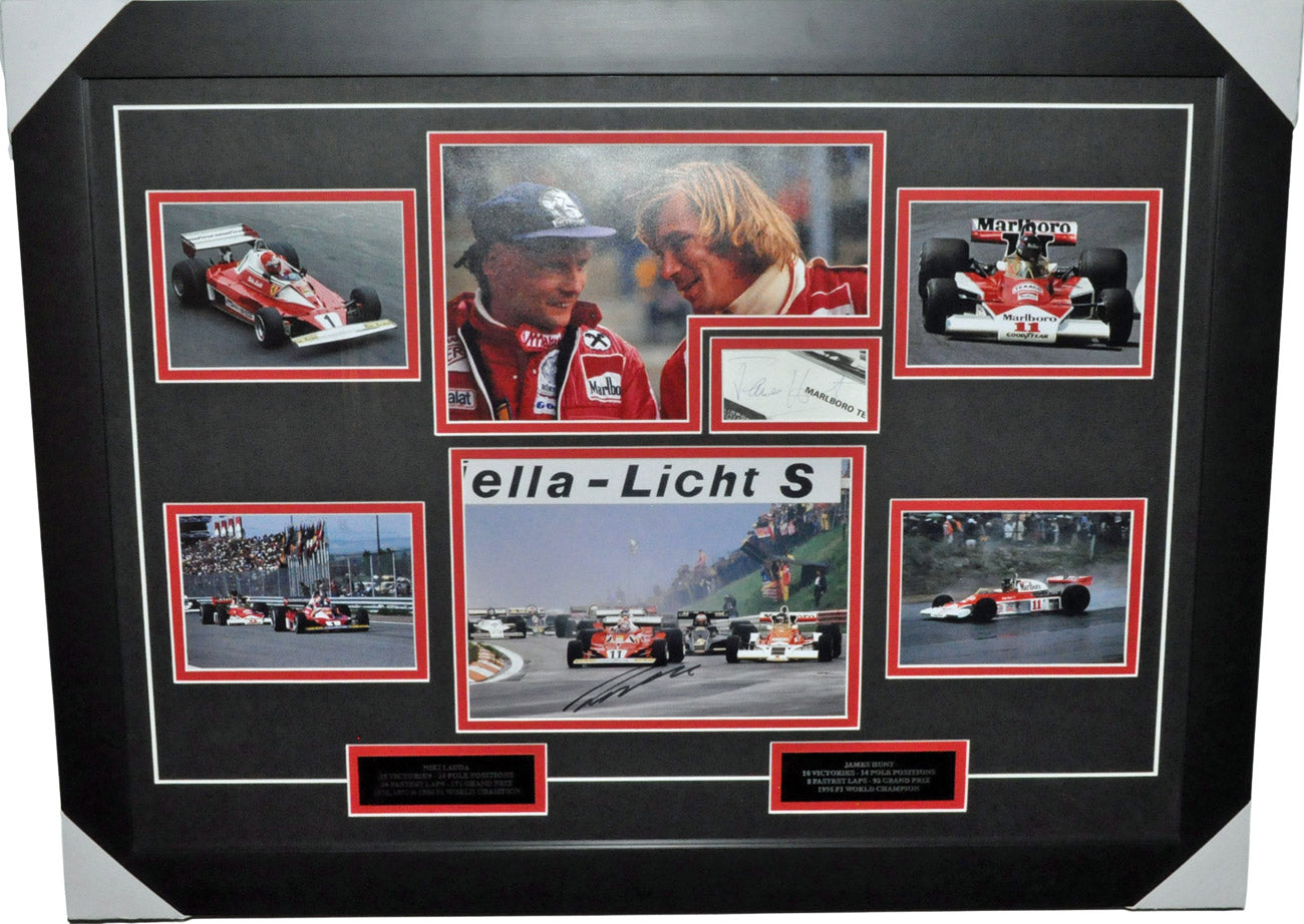 Regular price $3,999.95 USDJames Hunt & Niki Lauda Signed 1976 F1 Photos Montage Frame. Superbe 4 5X7 inches + 2 8X12 inches photos. Frame with two text plaques. One of the 2 8X12 inches photo hand signed by Niki Lauda and a hand signed autograph on a piece of paper from a Formula 1 Grand Prix Program by James Hunt.
