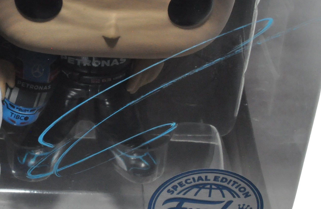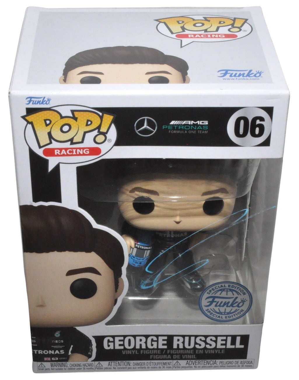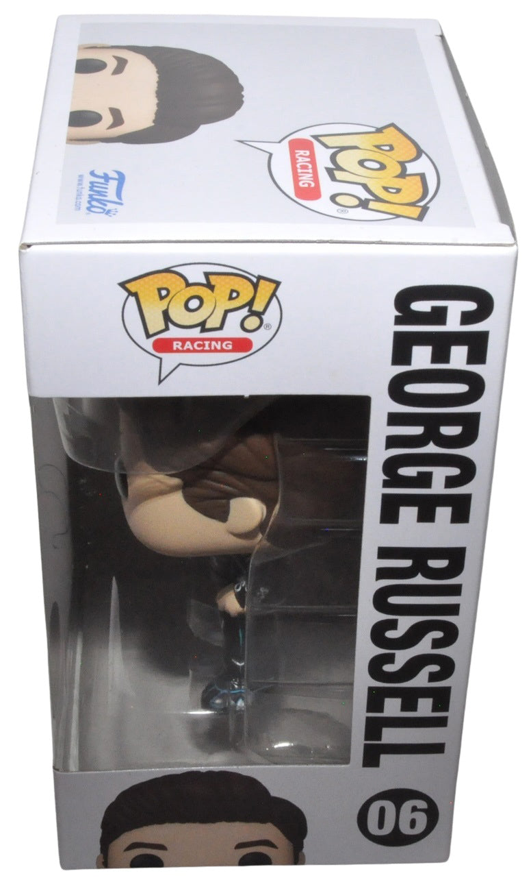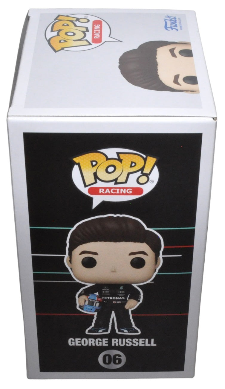 George Russell Signed Funko Pop Mercedes AMG Petronas Formula One Team 06. Signed on the box. The Funko Pop box is approximately 3.5 inches deep x 4.5 inches wide x 6.25 inches tall.