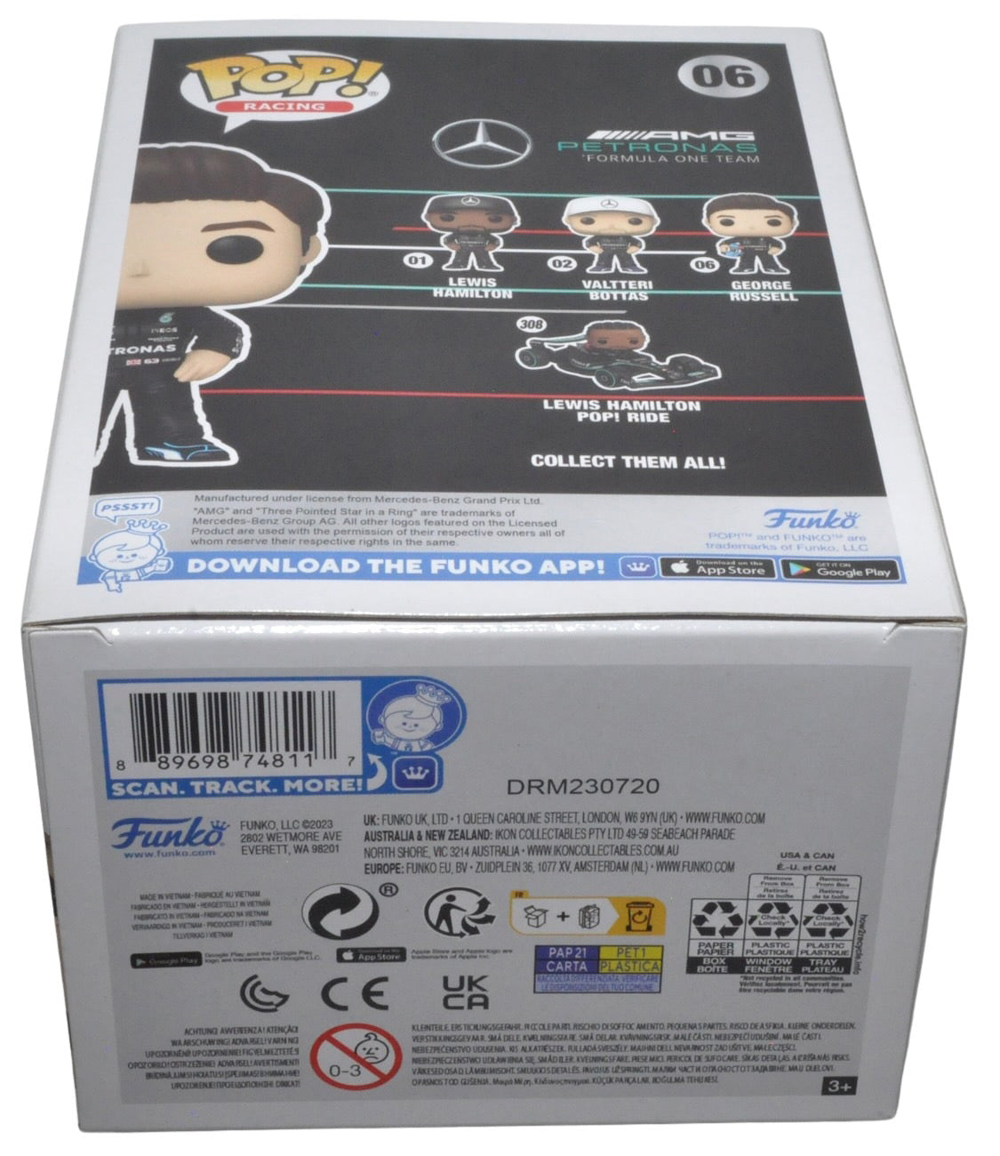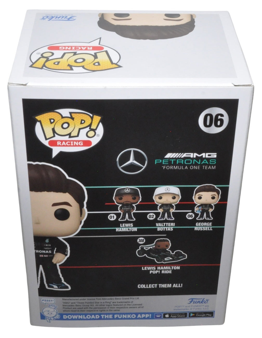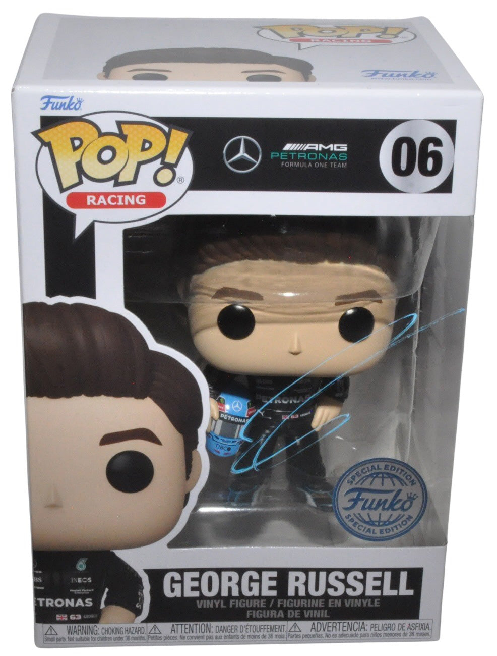 George Russell Signed Funko Pop Mercedes AMG Petronas Formula One Team 06. Signed on the box. The Funko Pop box is approximately 3.5 inches deep x 4.5 inches wide x 6.25 inches tall.