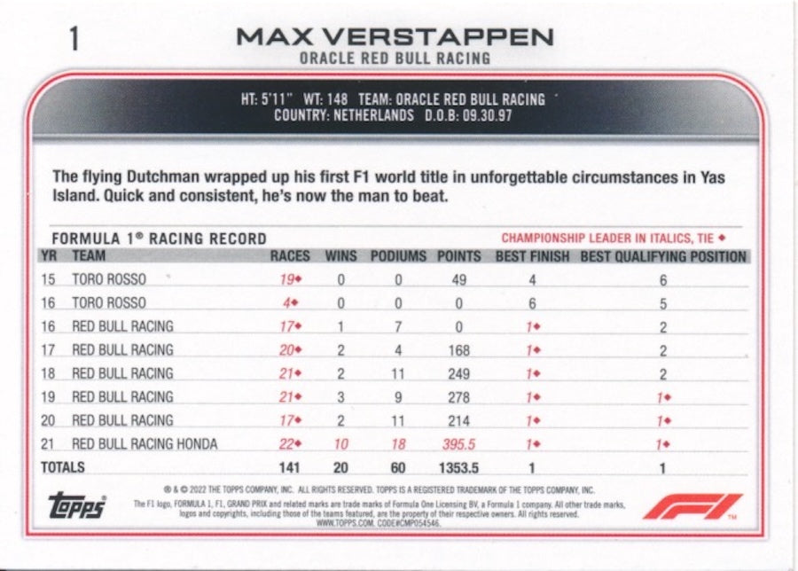 Regular price $249.95 USDMax Verstappen Signed 2022 Topps Chrome Formula 1 Red Bull Racing F1 Team #1 Card.