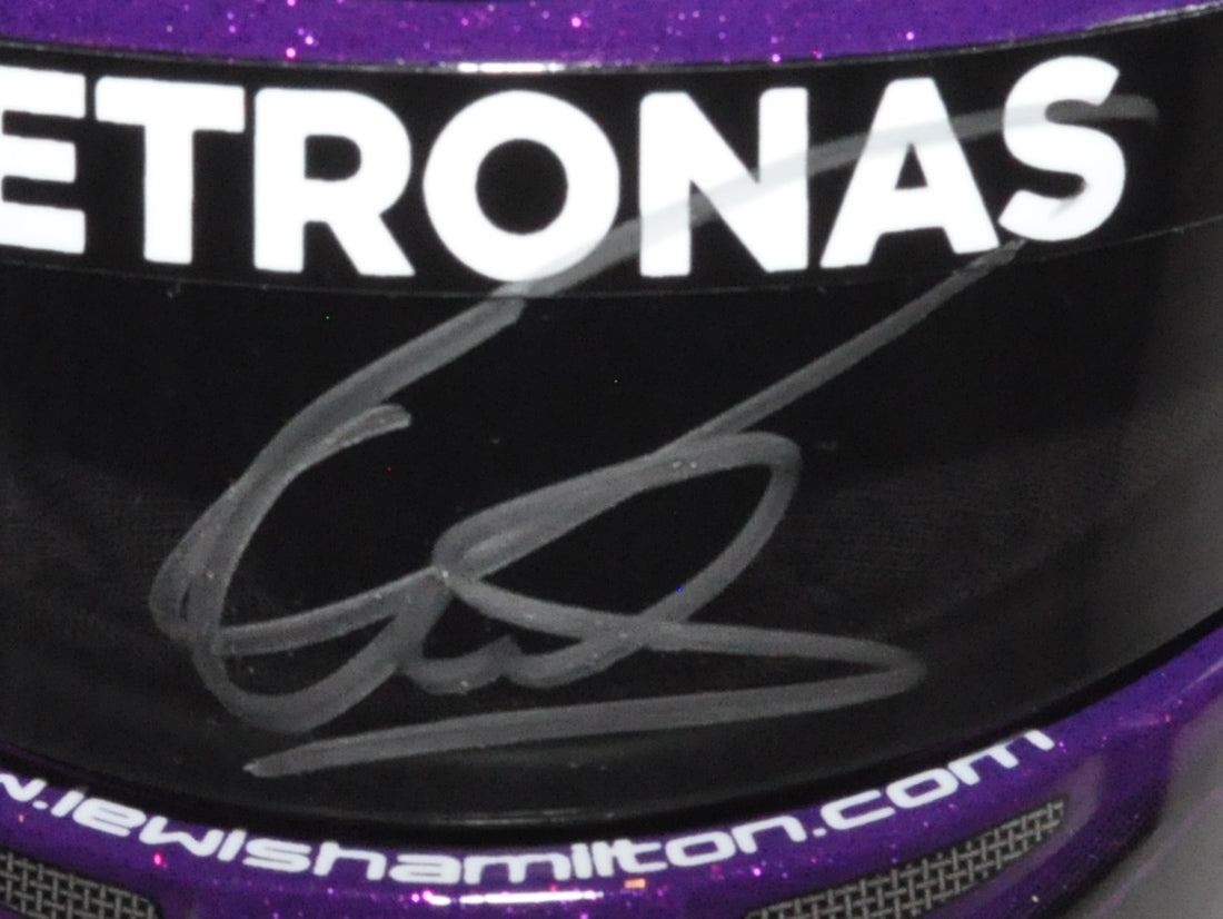 Lewis Hamilton Signed Replica 1/2 F1 2020 Purple Mercedes F1 Helmet. This official half scale helmet is approximately 6 inches / 15cm high. Comes complete with the Mercedes F1 Team official box.