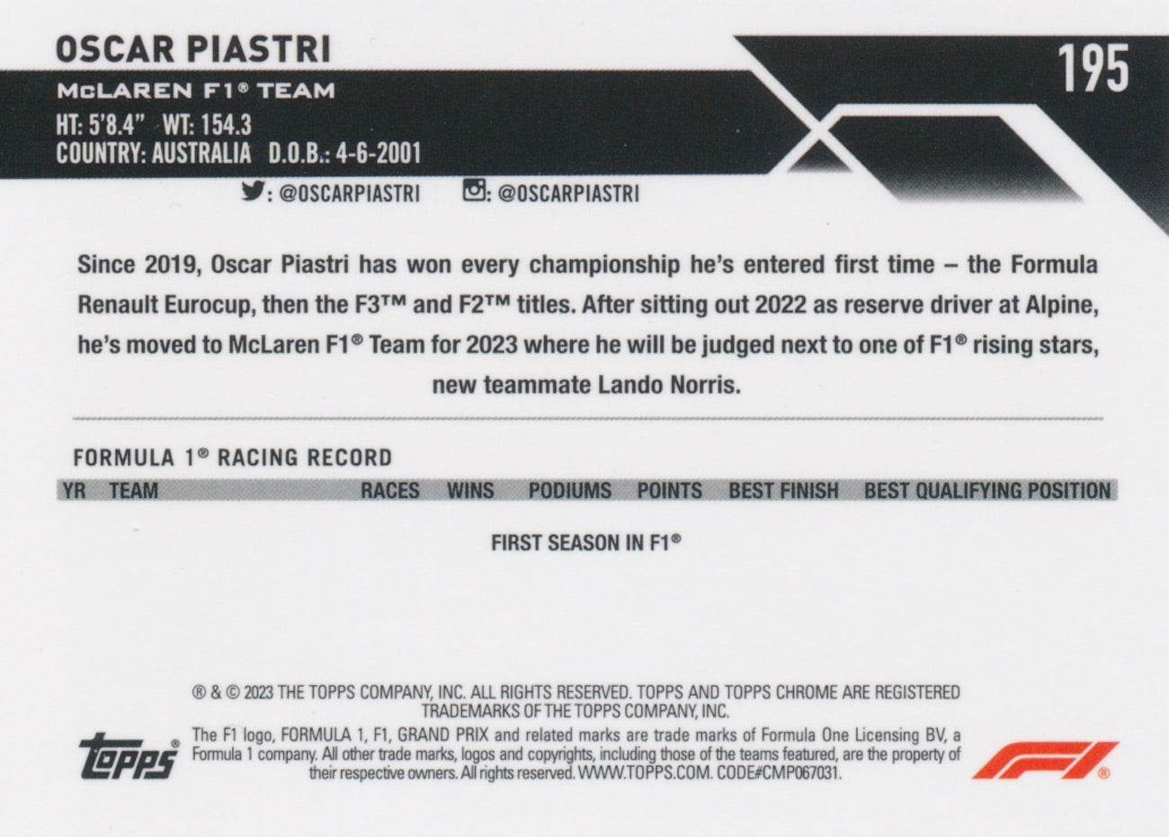 Oscar Piastri - Carte 2023 Topps Chrome Formula 1 McLaren F1 Team #195 Signée