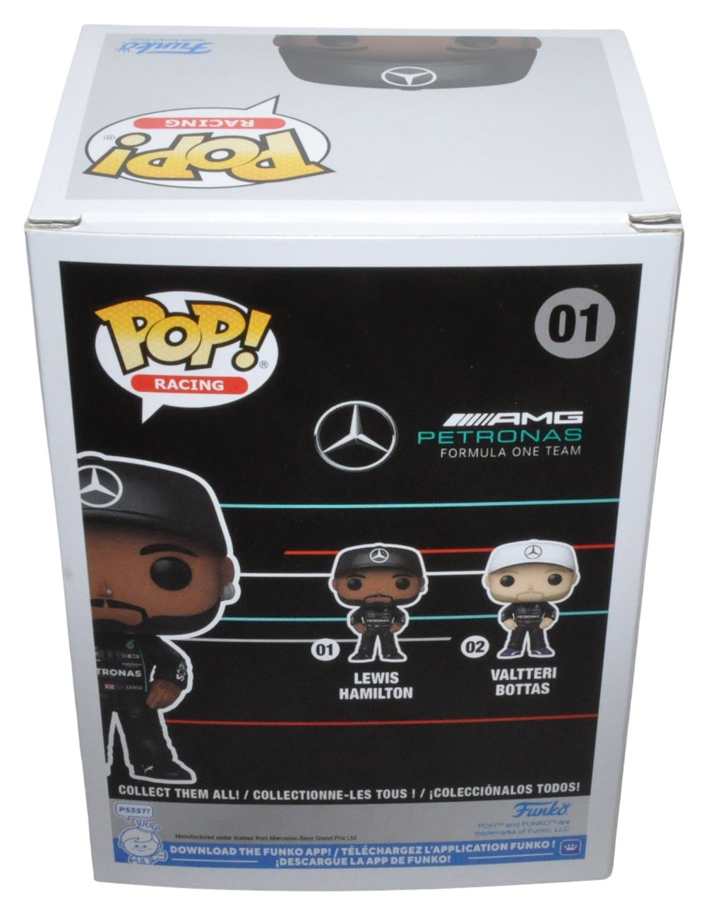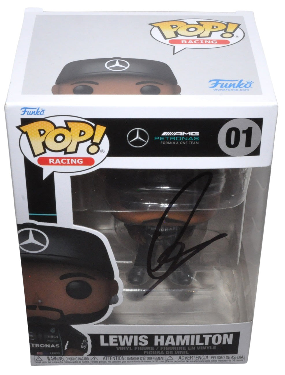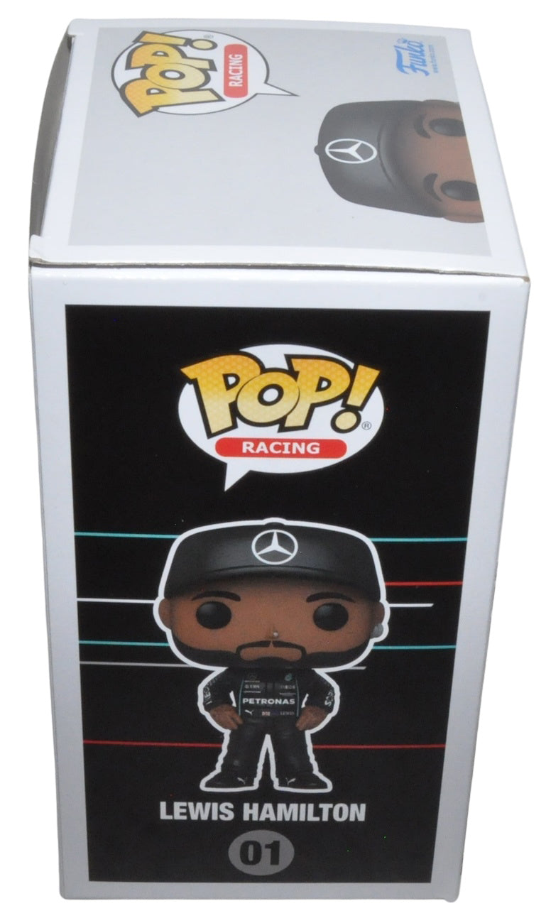 Lewis Hamilton Signed Funko Pop Mercedes AMG Petronas Formula One Team 01. Signed on the box. The Funko Pop box is approximately 3.5 inches deep x 4.5 inches wide x 6.25 inches tall.